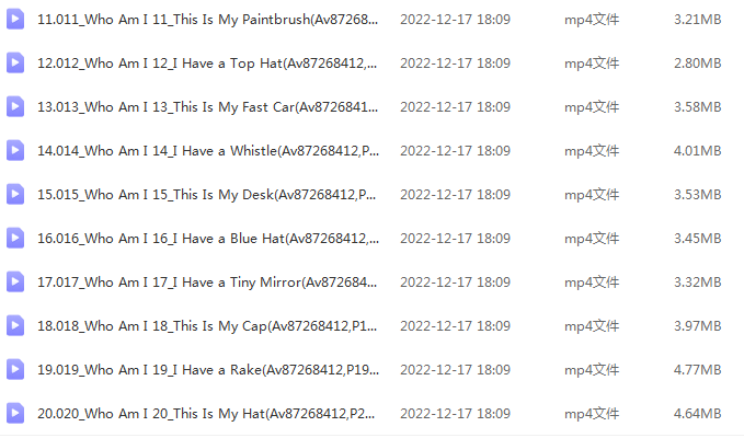 咿呀学语U乐园收录的动画片《猜猜我是谁 Who Am I》包含:MP4格式视频20集,MP3格式音频20集,PDF格式绘本20册,一册单词表和原文,视频单集大小5M左右。